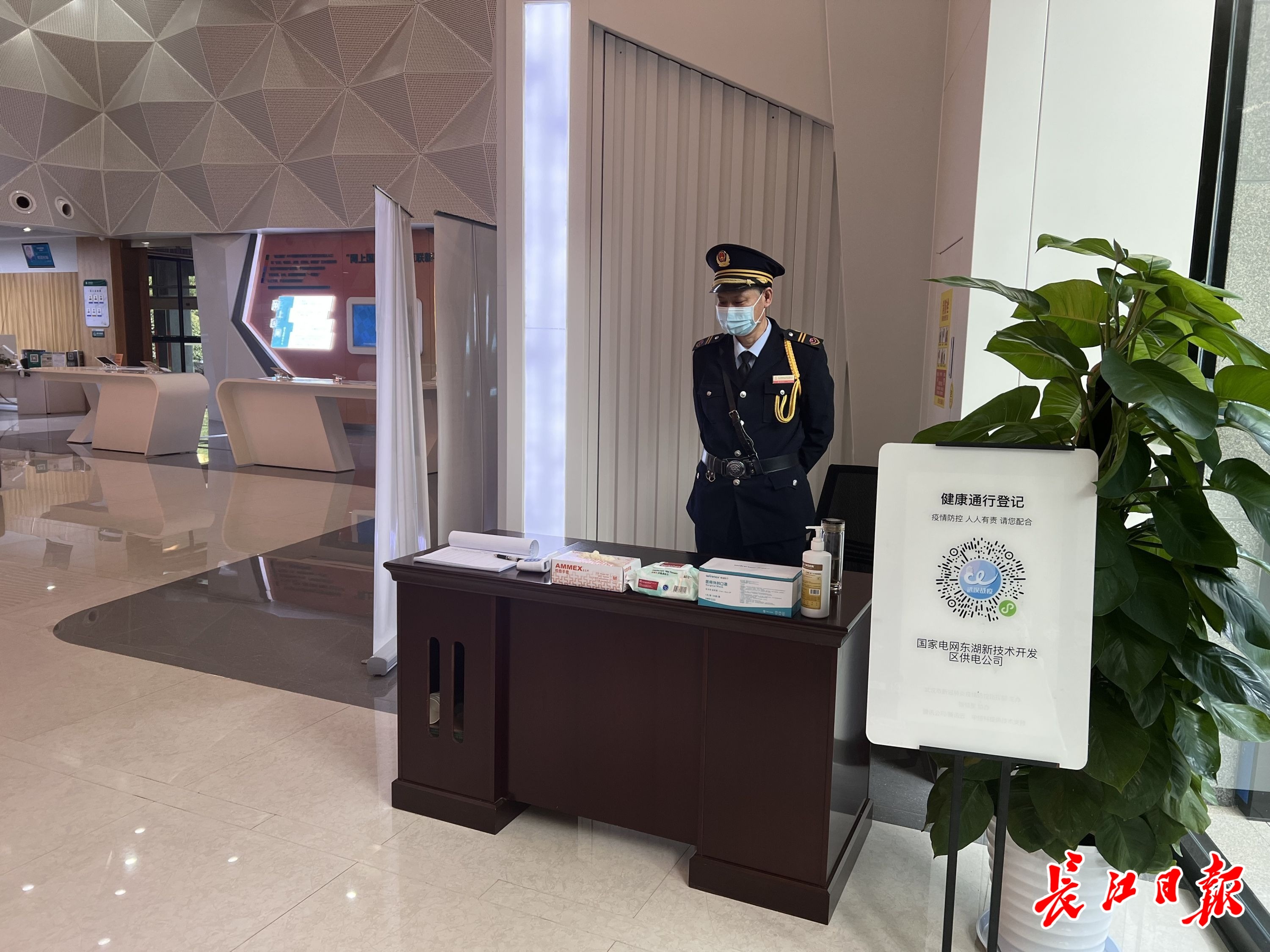 国网武汉市东湖高新区供电公司营销部主任黄琳介绍,目前每位前来营业厅办理业务的人员都需要查验健康码及行程码,该公司设置专人在入口处值守,引导、提示进入人员做好验码及佩戴口罩等工作,并通过电子显示屏、展板等开展防疫宣传。