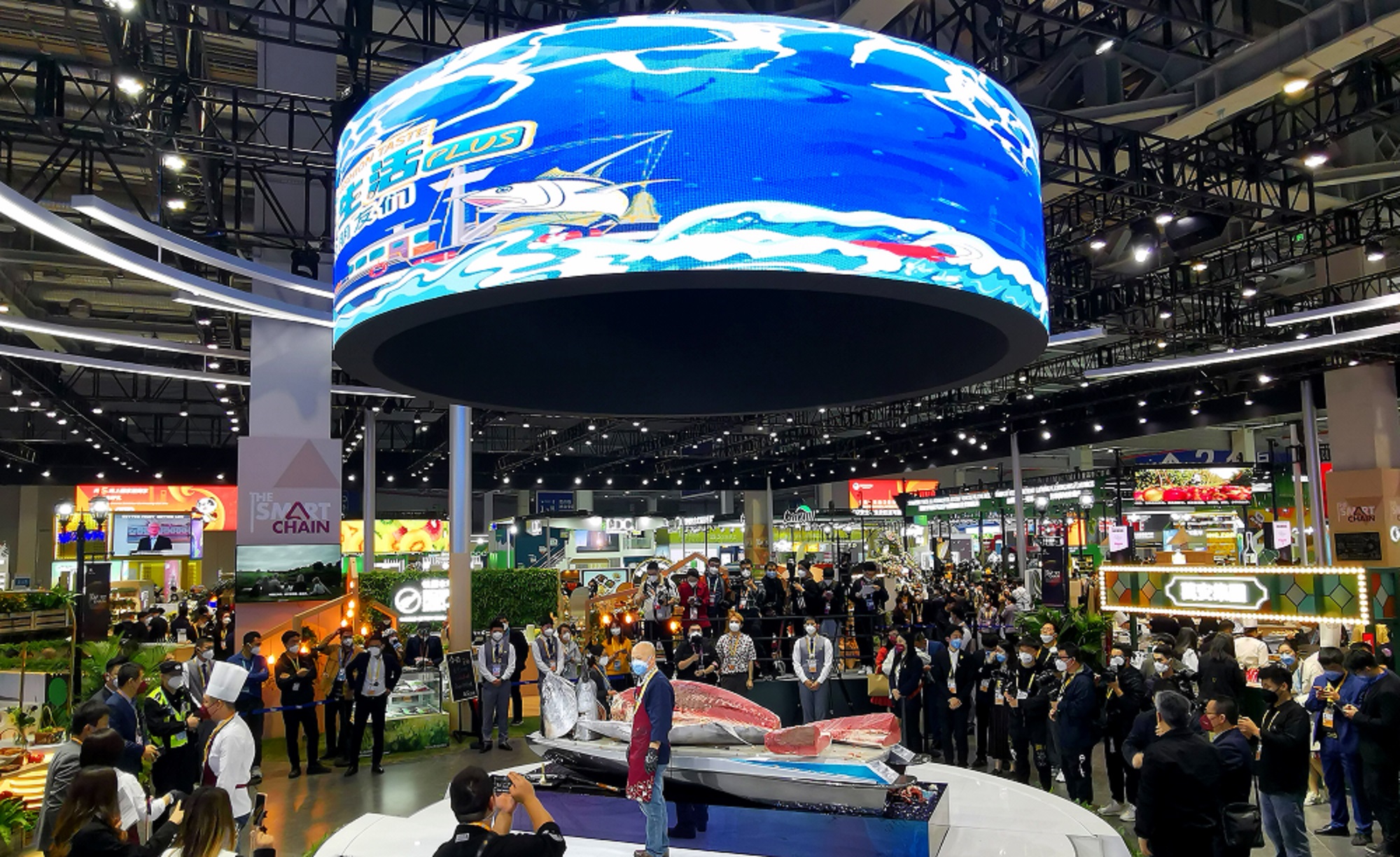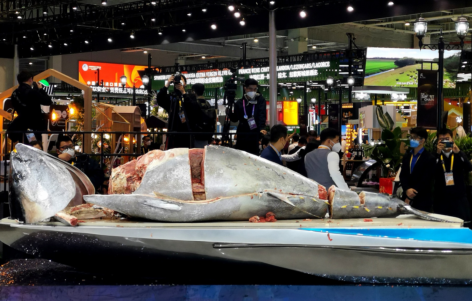 金枪鱼鱼王的“开鱼秀”是进博会食品馆的亮点,首届进博会上的大西洋蓝鳍金枪鱼重258公斤,第四届进博会上的重353公斤,本届进博会上金枪鱼重量又一次刷新记录。