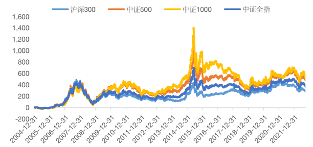 其次是,在市场反弹初期,中证1000指数收益的爆发性较强,阶段性收益明显强于其他主流指数。通过Wind数据复盘历史数据发现,A股每一轮见底反弹后,中证1000指数的涨幅明显高于沪深300、中证500、中证全指等。以2022年4月27日沪指见底2863点为例,这一波反弹持续到8月4日,期间中证1000指数累计涨幅达32.16%,而沪深300、中证500、中证全指的涨幅分别为8.39%、17.67%、16.51%。
