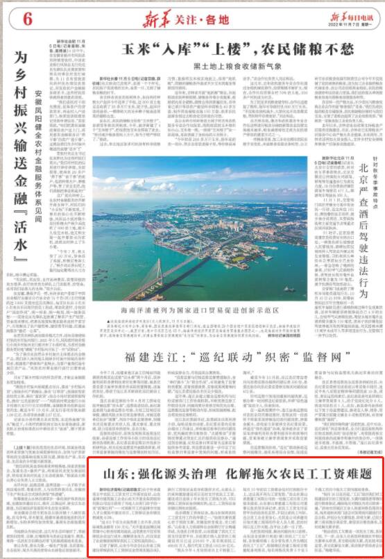 11月7日,《新华每日电讯》以《山东:强化源头治理 化解拖欠农民工工资难题》为题点赞山东保障农民工工资支付工作举措。全文如下: