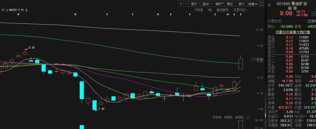 11月8日开盘,紫金矿业开盘一度触及涨停,截至收盘,紫金矿业报涨8.73%,报9.09元每股。