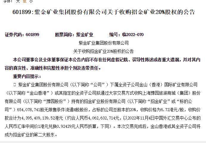 紫金矿业长期以来被冠以屯矿大户之名,今年以来,这家矿业龙头明显加快了收矿步伐,11月6日晚间,紫金矿业发布公告称,下属全资子公司拟通过大宗交易方式收购豫园股份持有的招金矿业无限售条件流通H股股份,占标的公司总股本的20%,收购价款合计为40.63亿元人民币;本次交易完成后,该子公司将成为招金矿业的第二大股东。