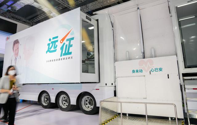 11月6日在第五届进博会医疗器械及医药保健展区西门子展台拍摄的“远征”5G移动急危重症救治单元。新华社记者丁汀 摄