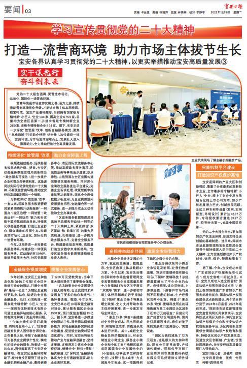 营商环境是市场主体发展之基、活力之源,持续推动营商环境优化升级,才能让市场主体本固根深、枝繁叶茂。宝安产业基础雄厚,当前拥有国家级专精特新“小巨人”企业134家、国高企业6759家,总量均为全省区县第一,并拥有省级专精特新企业260家、市级专精特新企业894家。眼下,宝安正进一步深化“放管服”改革,创新金融服务模式,聚焦“急难愁盼”打好助企纾困“组合拳”,加快建设一流营商环境,为市场主体迎难而上、发展壮大注入澎湃动力,全力推动经济社会高质量发展。