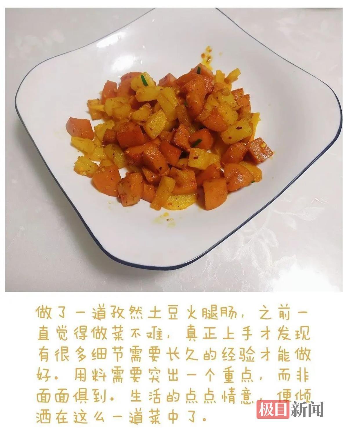极目新闻记者看到,在展出的美食作品中,不仅有川菜、粤菜等菜系,也有羊肉串、披萨、煎蛋、面包等小吃。该班班主任艾巍老师介绍,近来孩子们不仅学习压力大,长期与父母呆在一起,亲子关系也变紧张。“希望通过这个活动,让学生为家人做一份菜。做饭时学生既能了解家长的辛苦,又能缓解紧张的亲子关系,也能缓解网课的压力。”