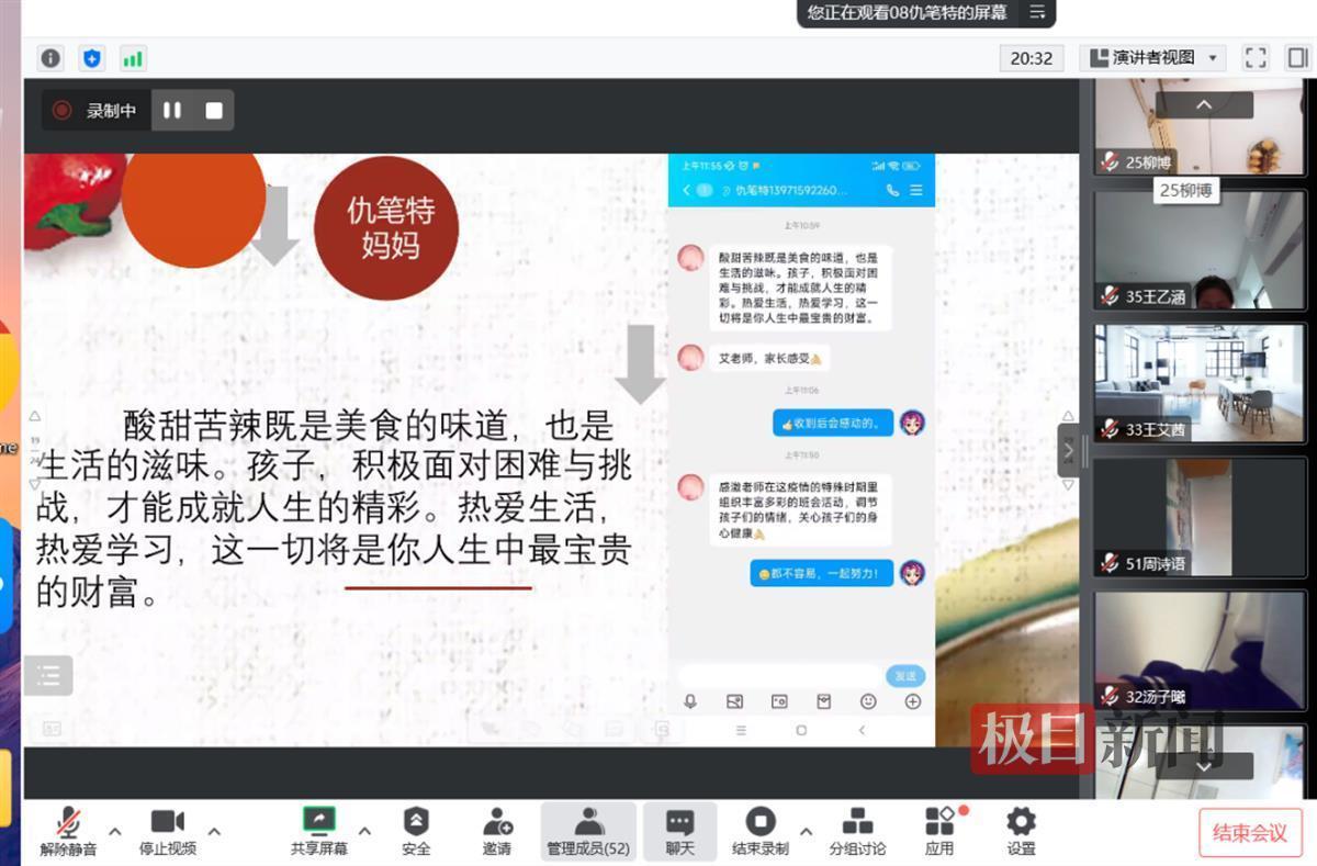 班会上,同学们七嘴八舌地连麦,一边介绍着菜品,一边分享着做菜心得。该班同学感慨道,自己偶尔做饭已是不易,现在更能体会父母的辛苦。也有同学趁此机会当好“家长”,顺带照顾同时上课的弟弟妹妹。