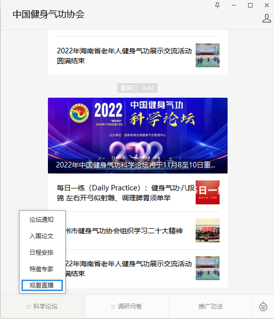 2.通过“中国健身气功协会”微信公众号页面中“科学论坛”菜单栏点击“论坛直播”进行观看。
