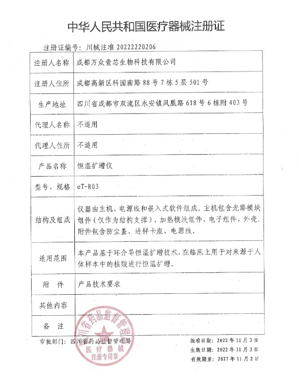 11月3日,由我校华西医院联合成都万众壹芯生物科技有限公司共同研发的可随身携带的便携式核酸快速扩增仪获国家药监局医疗器械注册证(注册证编号:川械注准20222220206),这是该产品获得CE认证后的又一突破。该产品是目前国内上市的体积最小的核酸快速扩增仪,具有良好的扩展性,除可以对新型冠状病毒样本进行扩增以外,未来还可以用于甲流、乙流、HPV等病毒样本的快速扩增。