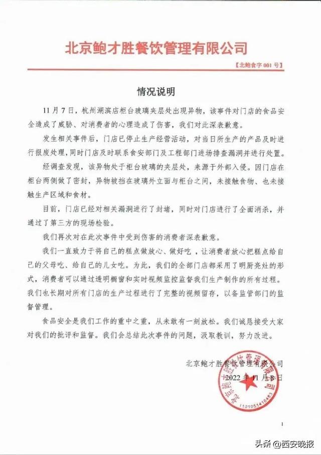 11月8日中午,“鲍师傅糕点”通过官方微博正式致歉,并称,经调查发现,老鼠“处于柜台玻璃的夹层处,来源于外部入侵。因门店在柜台两侧做了密封,异物被挡在玻璃外立面与柜台之间,未接触食物,也未接触生产区域。”