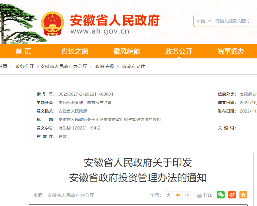 11月10日,安徽省人民政府网站发布通知,印发《安徽省政府投资管理办法》。《办法》明确,政府及其有关部门不得违法违规举借债务筹措政府投资资金。县级以上人民政府加强对政府投资资金的预算约束。安排政府投资资金,应当平等对待各类投资主体,不得设置歧视性条件。