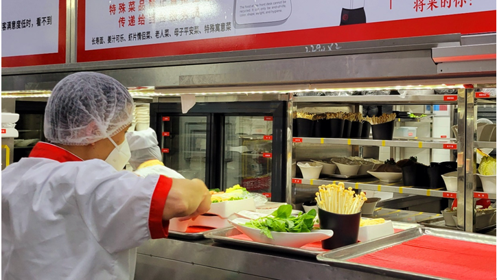 图说:海底捞后厨员工正在补充货架。