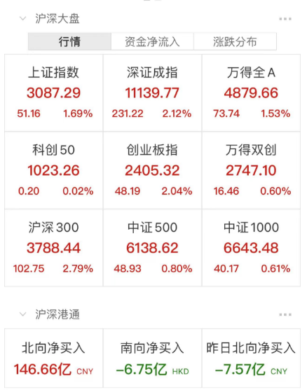 截止收盘沪指涨1.69%,深成指涨2.12%,创业板指涨2.04%。两市共2826只个股上涨,1973只个股下跌。北向资金净买入146亿元,创9月9日以来新高。