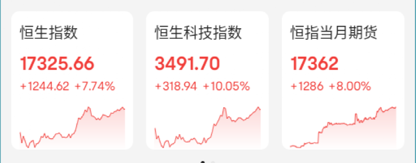 内外皆是重大利好下,港股重拾动能,此前上涨的预期正开始兑现,市场情绪进一步改善。恒生指数今日大涨1200点,涨幅达7.74%,科技指数上涨10% ,涨幅均仅次于今年3月16日,为年内第二大单日涨幅。