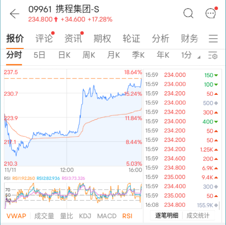 受此影响,航空股大幅走高,东航涨超5%,南航涨超3%。消费旅游股爆发,携程大涨17%,中国中免大涨7%。