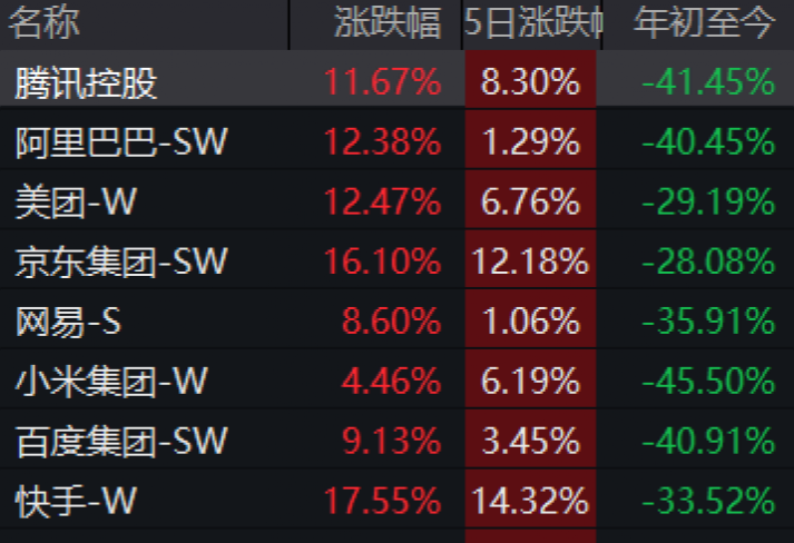 大市向好,超跌板块猛涨,其中科技股领涨,腾讯、阿里、美团、京东四大权重涨幅均超11%。