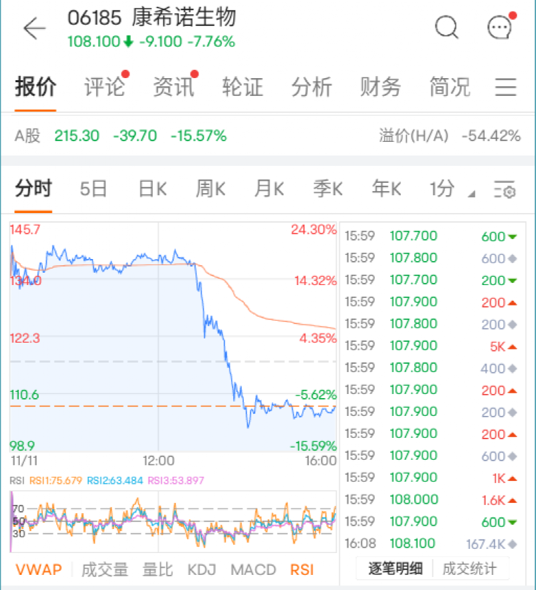 但也有一些个股逆市下跌, 因吸入式疫苗而大涨的康希诺生物,今日走出了由涨至跌的反转行情。早盘一度涨超15%,午盘跳水一度跌近15%,振幅超37%。