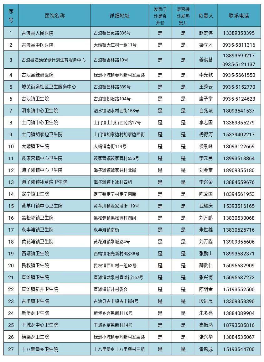 根据疫情防控工作需要,古浪县卫生健康系统进一步优化服务,各医疗机构发热门诊(哨点)应设尽设、应开尽开,最大限度保障人民群众的基本医疗服务。现将全县27家发热门诊(哨点)相关信息公布如下: