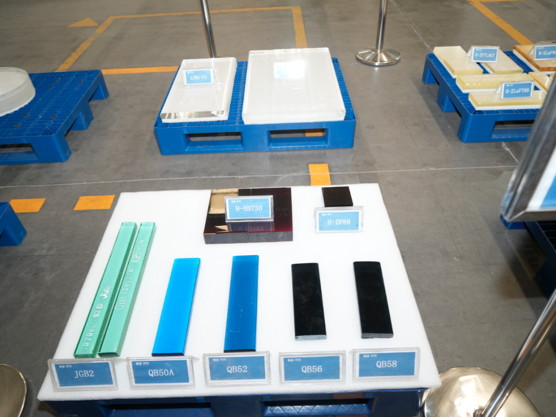 一条条包裹着灰色或蓝黄色外壳的生产通道安静地待在车间里,靠近后才能感受到机械内部运作发出的声音。据了解,这是用来给玻璃降温的徐冷炉。从熔炼池炉中缓缓流出的玻璃溶液,经过特殊模具成型为光学玻璃,最开始温度在1000度以上,它们会进入到细长的徐冷炉中,按照设定工艺逐步降温至室温,在徐冷炉的末端,工人按照一定长度进行切割,光学玻璃条料产品就诞生了。