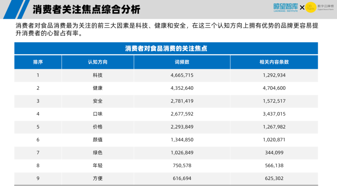 研究报告发现,消费者对食品消费最为关注的前三大因素是科技、健康和安全,高于价格、方便等基础购买决策因素,在这三个认知方向上拥有优势的品牌更容易提升消费者的心智占有率。