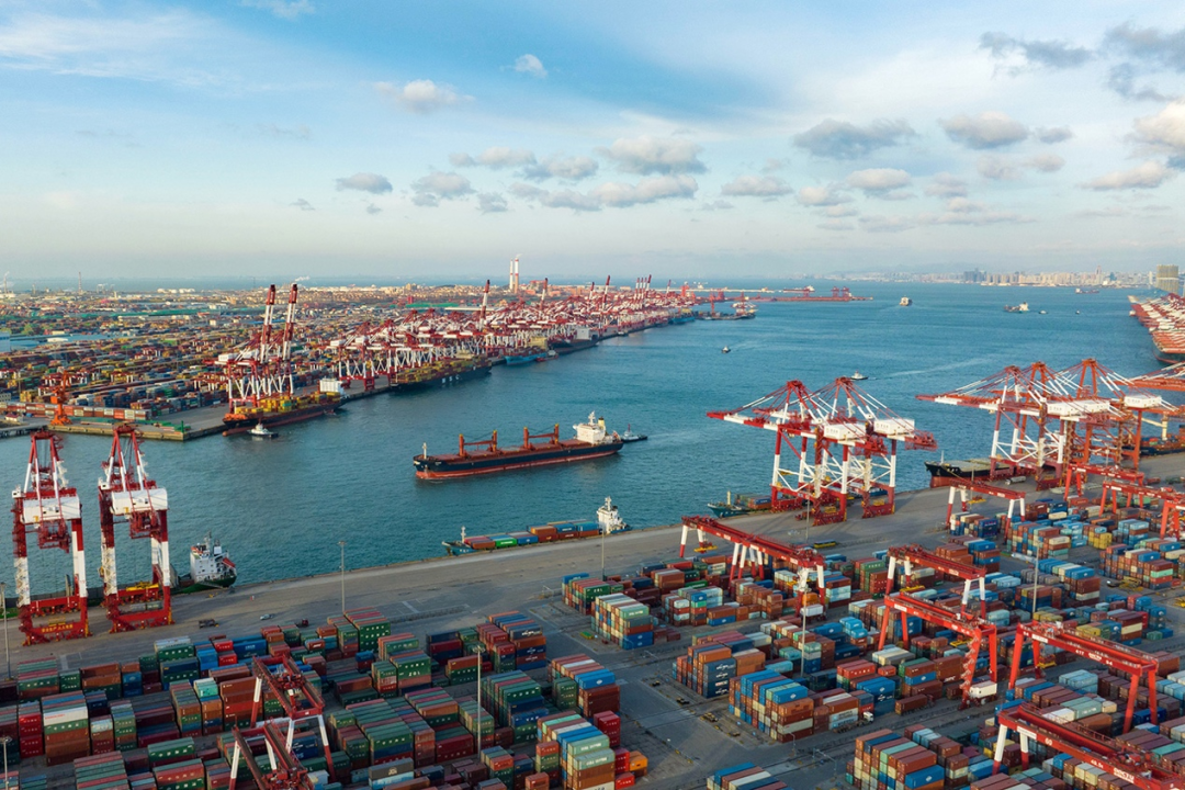 2022年11月30日,山东港口青岛港前湾集装箱码头,装卸作业一派繁忙。图|IC photo
