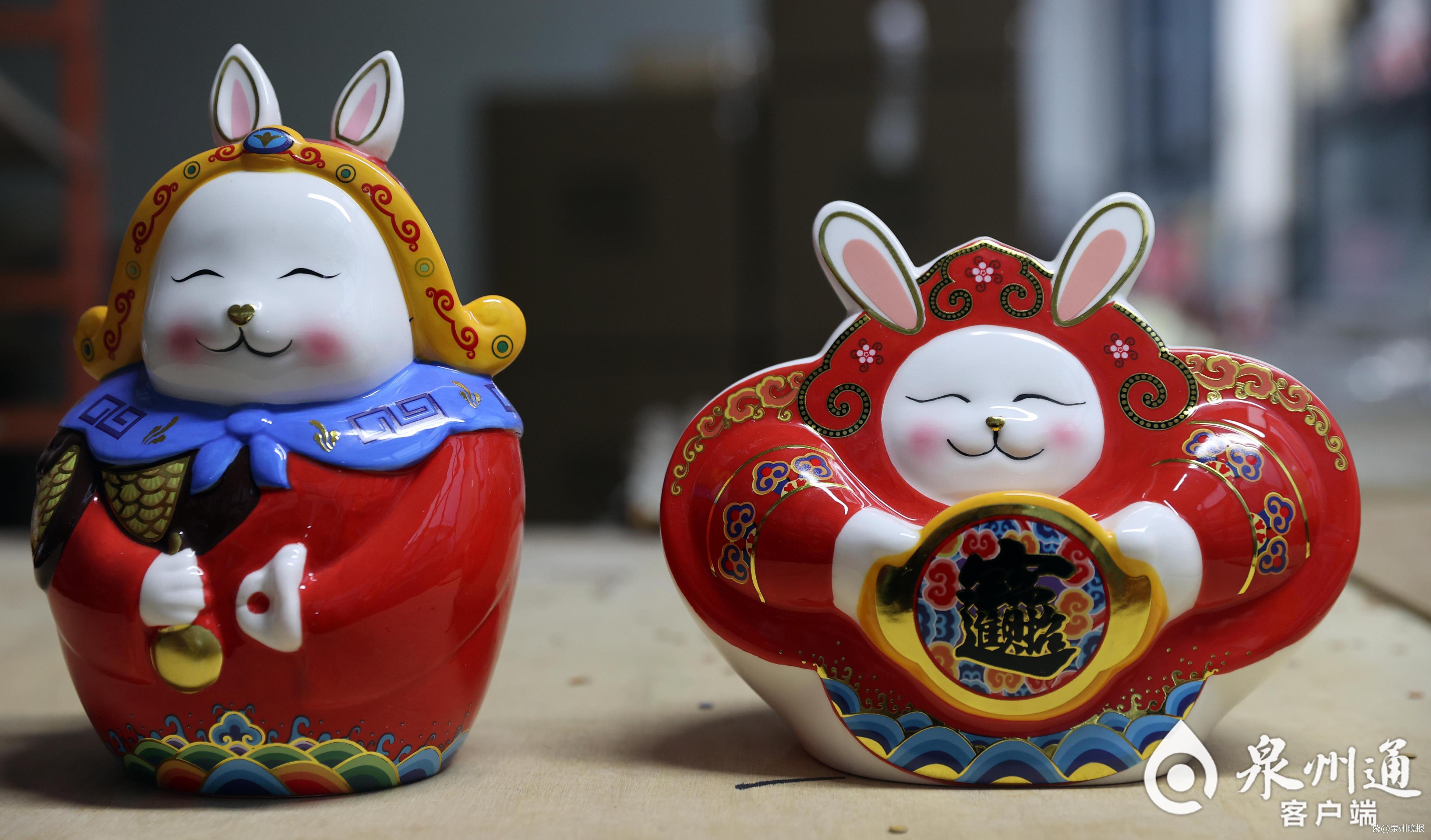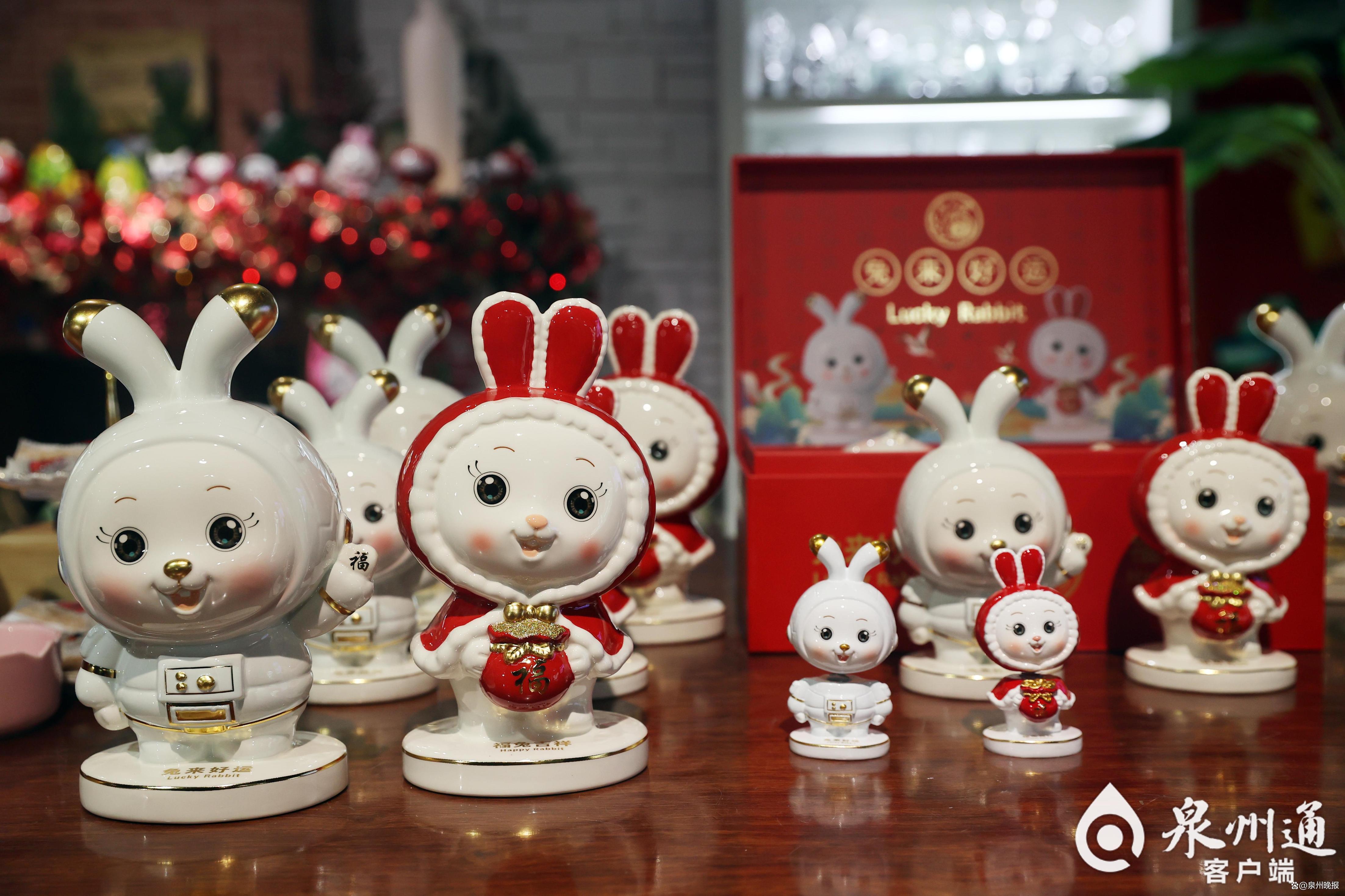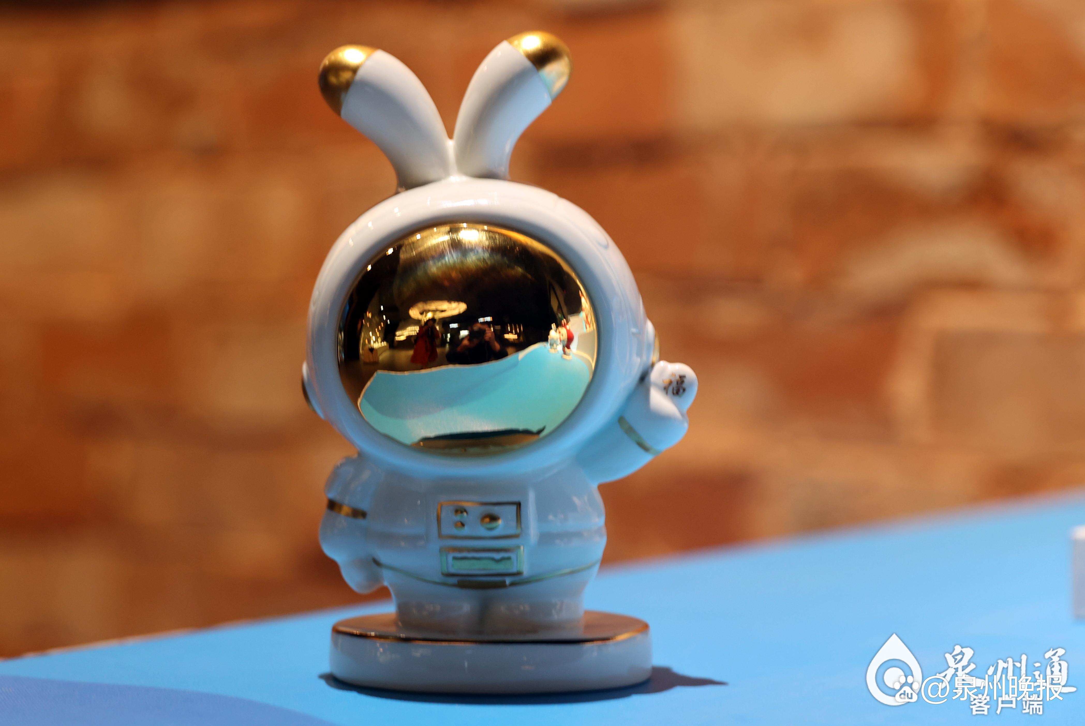 在泉州顺美集团,记者见到了一对憨态可掬、萌趣十足的陶瓷兔子。这是该公司最近刚推出的《兔来好运·福兔吉祥》兔年吉祥物礼盒。其中一只兔子昵称“兔宝”,身披中国红幸运斗篷,怀中抱着一个红色福袋,寓意送福入万家,看起来十分祥和喜庆。另一只兔子昵称“兔墩”,化身现代宇航员的形象,致敬中国航天事业发展蒸蒸日上,千年太空梦尽显于此。