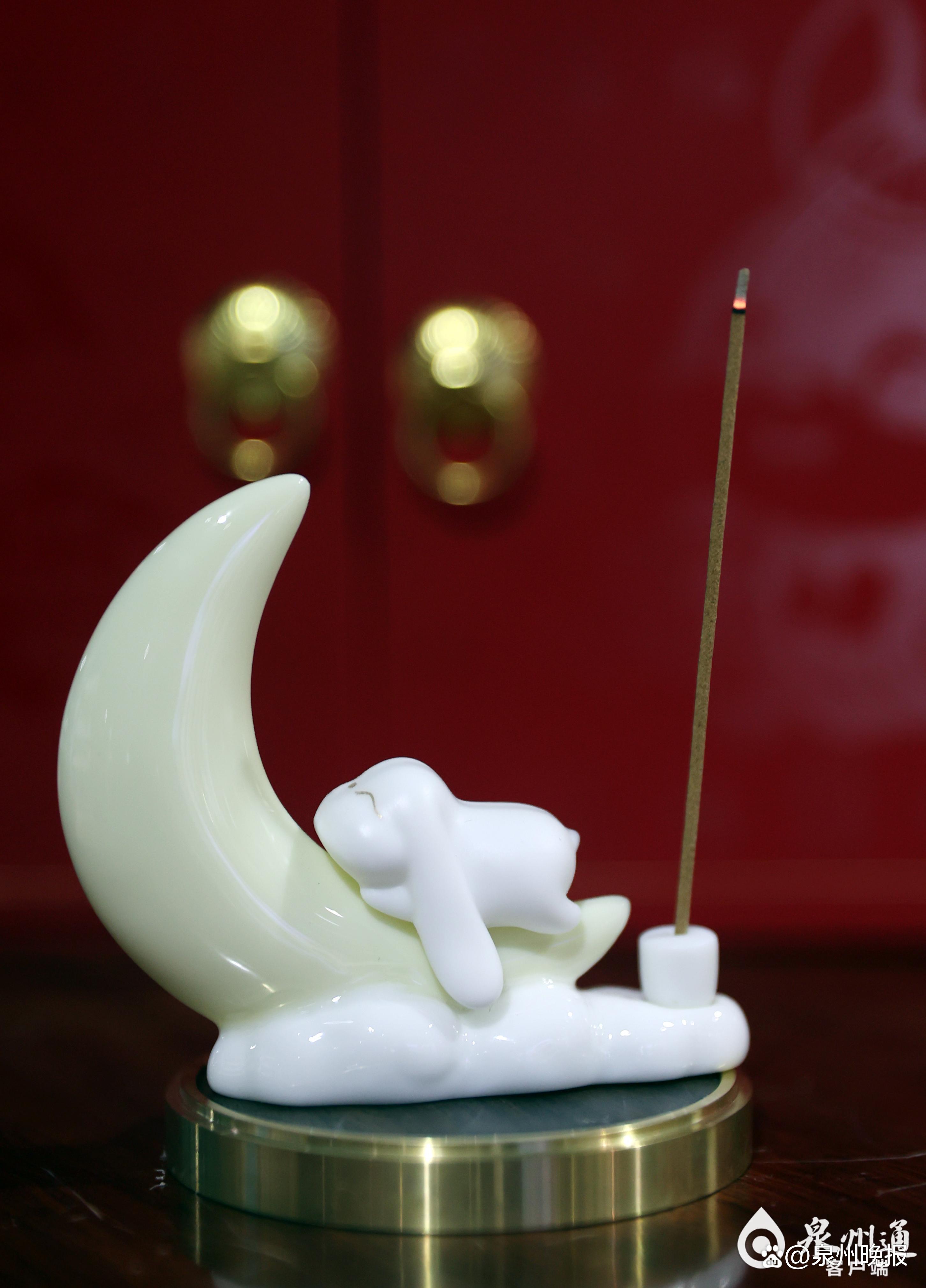 日用品中,兔子元素与茶具、餐具结合较多,泉州顺美集团项目部经理郑衍圣另辟蹊径,将兔子元素运用到陶瓷香插设计中。“这款香插造型主要取自我国古代神话作品《山海经》中,形态类似兔子的上古神兽犰狳,将其可爱化、生活化,看起来十分新潮,深得年轻人喜欢。”郑衍圣说。