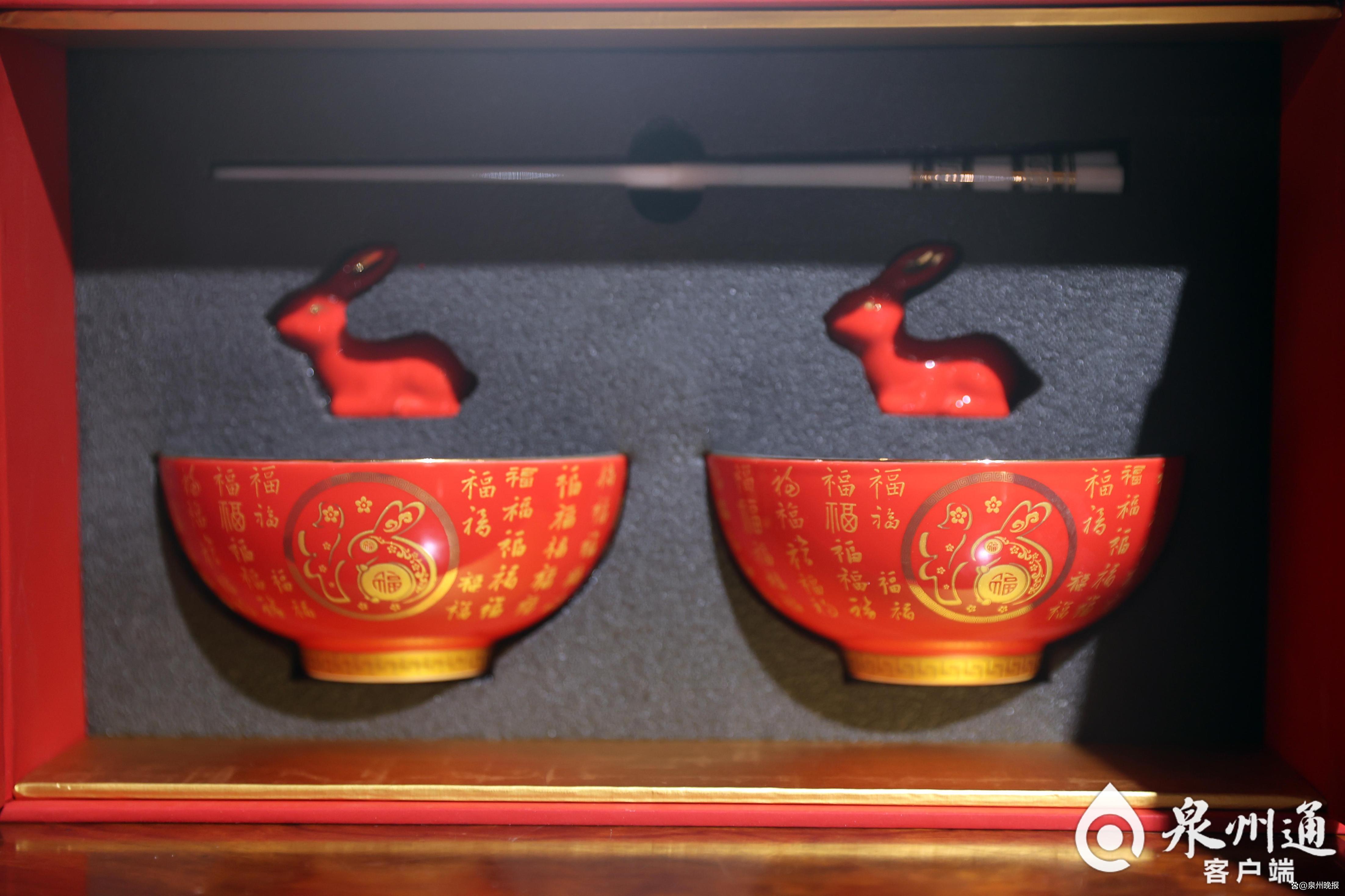 泉州顺美集团设计的一款《百福玉兔》对碗礼盒,一共有两款不同颜色可供挑选。每款礼盒中内含2只对碗、2双陶瓷筷子以及2只兔子造型的筷架。整套餐具看起来喜庆祥和,碗身还可见历代不同书法家创作的一百个描金书法“福”字,其中最大的一个福字还被设计成兔子造型,带有满满的中国风。“礼盒中那对兔子造型的筷子架,率先收获一大波‘粉丝’。”郑鹏飞说。