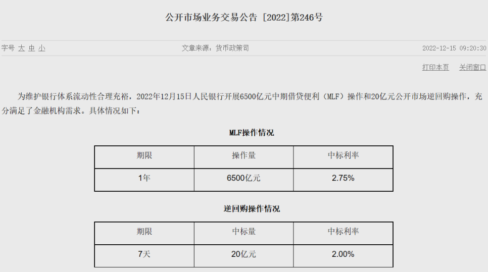12月15日,人民银行发布公告称,为维护银行体系流动性合理充裕,人民银行开展6500亿元中期借贷便利(MLF)操作和20亿元公开市场逆回购操作,充分满足了金融机构需求。与此同时,MLF操作利率与7天期逆回购利率均与上期持平。