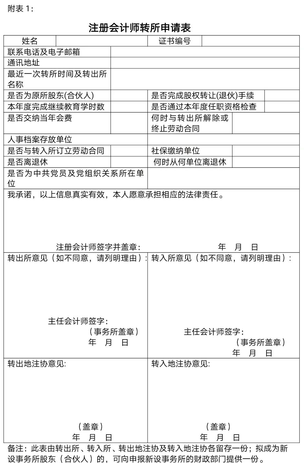 第五条 注册会计师申请转所,应当按照与转出会计师事务所(以下简称转出所)签订的劳动合同或者其他协议、约定,办理财务、业务等方面的交接事宜,填写“注册会计师转所申请表”(附表1,以下简称《转所申请表》)。