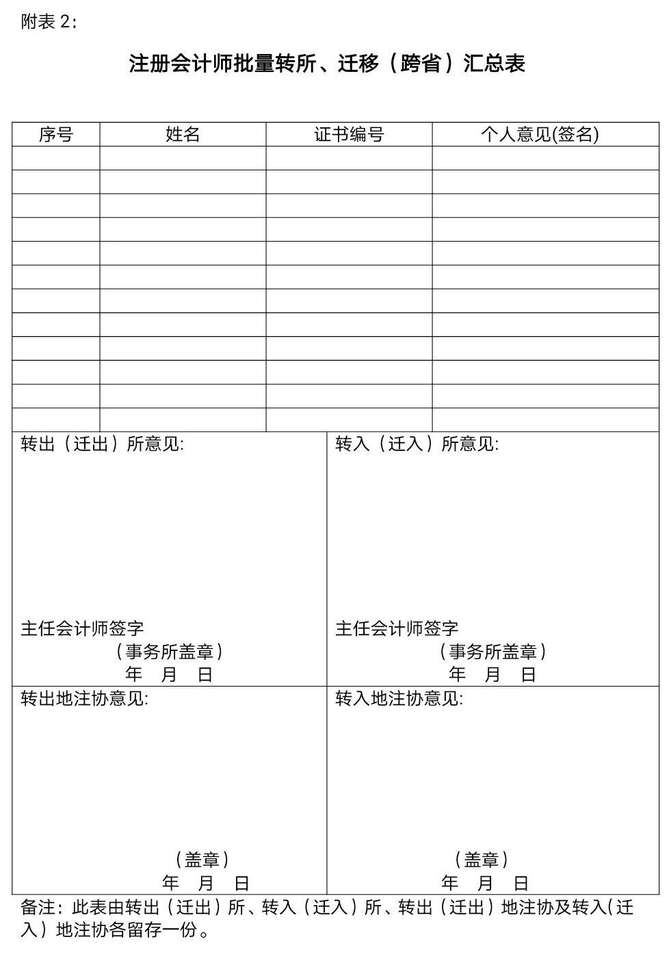 (二)会计师事务所提交“注册会计师批量转所、迁移汇总表”(附表2,以下简称《注册会计师汇总表》)、会计师事务所合并(分立)相关协议或决议复印件、注册会计师证书;