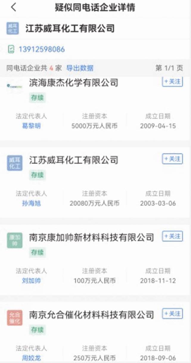 企查查显示,江苏威耳的工商登记信息中,使用邮箱为haiyan.wang @ chemspec.com.cn(见图一),其向当地市监机构提交的企业年报显示,2013年来均使用电邮。该企业工商信息中联系电话为13912598086,而相同电话企业还有滨海康杰,以及南京康佳帅新材料科技有限公司、南京允合催化材料科技有限公司(见图二)。