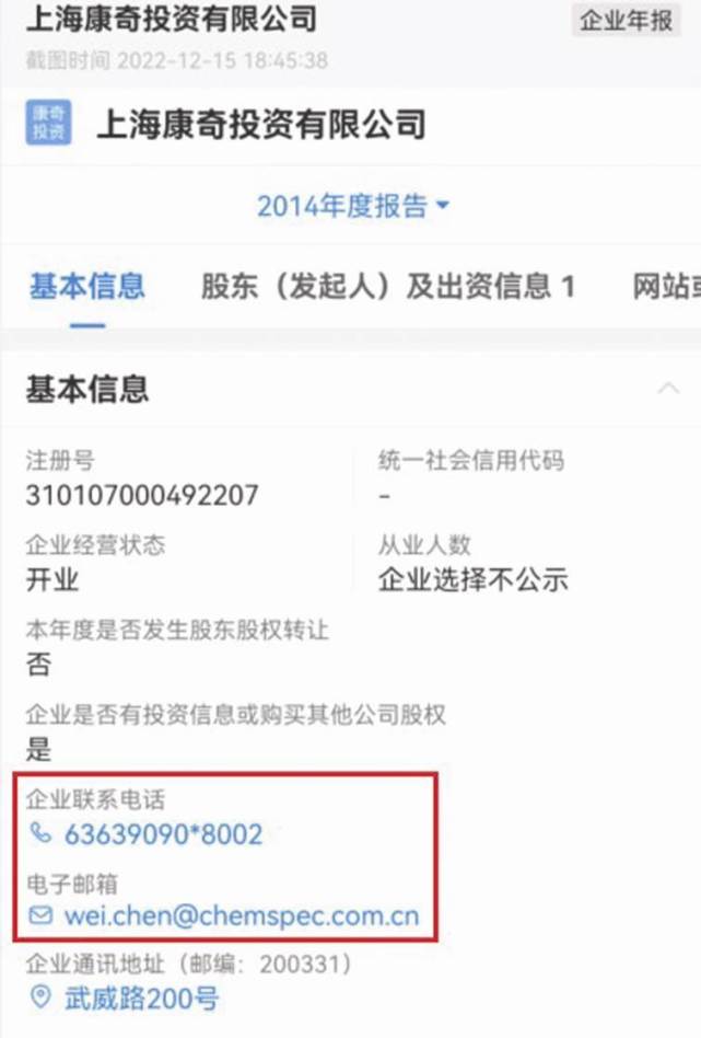 企查查显示,上海康奇投资有限公司系杨建华个人独资企业,工商登记信息中电话与康鹏科技相同,电邮也是公司英文后缀的企业邮箱。其向当地市监机构提交的企业年报显示,除了未公示的年份,其余均显示电邮为wei.chen@chemspec.com.cn。2013-2021年年报显示企业联系电话均使用021-63639090,2014年年报还显示分机号为8002(见图四)。
