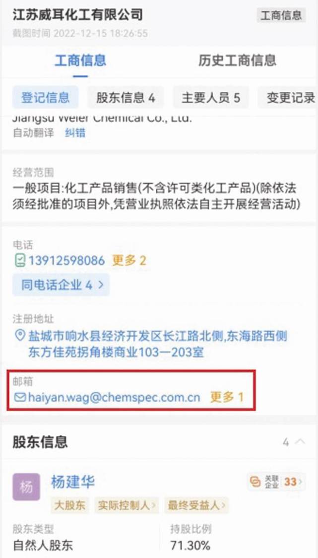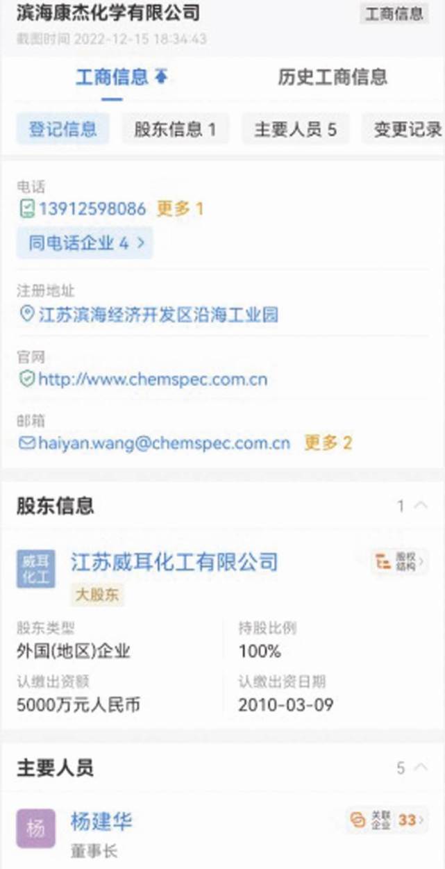 至于滨海康杰,其为江苏威耳全资子公司,企查查查询的工商登记信息显示电邮也是haiyan.wang@chemspec.com.cn,官网则是https://www.chemspec.com.cn(见图三)。该企业向当地市监机构提交的企业年报显示,2019-2021年的电邮均使用haiyan.wang@chemspec.com.cn,2016-2017年使用yuhe.su@chemspec.com.cn。