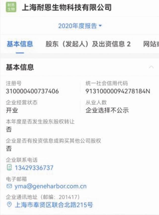 上海耐恩生物科技有限公司系港资企业,该港资控股股东基因港控股(GeneHarborHoldingLimited)为杨建华控制,据企查查信息,其向当地市监机构提交的2016-2018年年报显示,电邮使用lili.Zhong@chemspec.com.cn,而2020年使用其控股股东英文名后缀的邮箱yma@geneharbor.com.cn(见图五)。