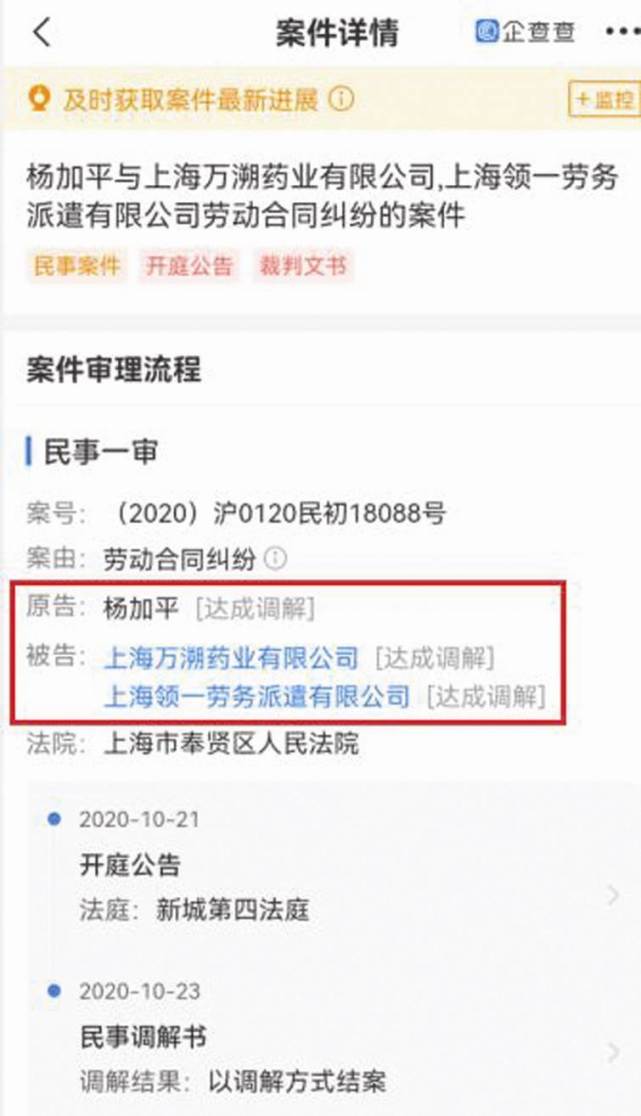 通过企查查查询显示,公司全资子公司上海万溯(即上海万溯药业有限公司)有一起作为被告的劳动合同纠纷案件——杨加平与上海万溯、上海领一劳务派遣有限公司劳动合同纠纷的案件。上海市奉贤区法院为民事一审法院,上海万溯、上海领一劳务派遣有限公司是被告,开庭时间为2020年10月21日,最终以调解方式结案,民事调解书日期为2020年10月23日,但调解内容未公示(见图八)。