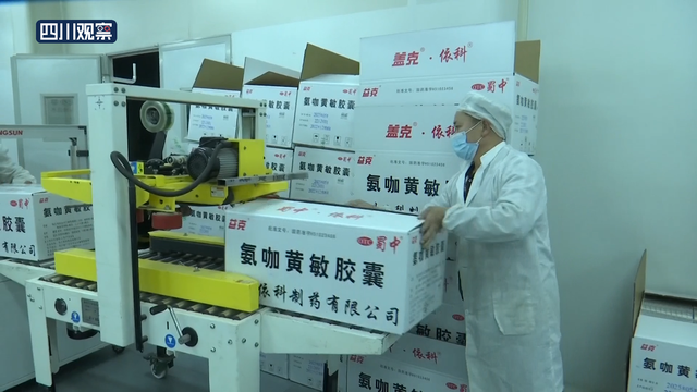 在广汉市四川蜀中制药集团医药包装车间,多条生产线正开足马力加班生产。随着市场对感冒类药品需求的加大,广汉各药企及时调整生产临床易短缺药品,为疫情防控及临床用药提供医疗物资供应保障。市场上目前最紧缺的感冒药品氨咖黄敏胶囊,日产量能达到1400万粒。