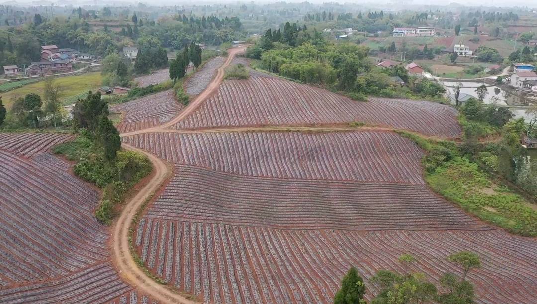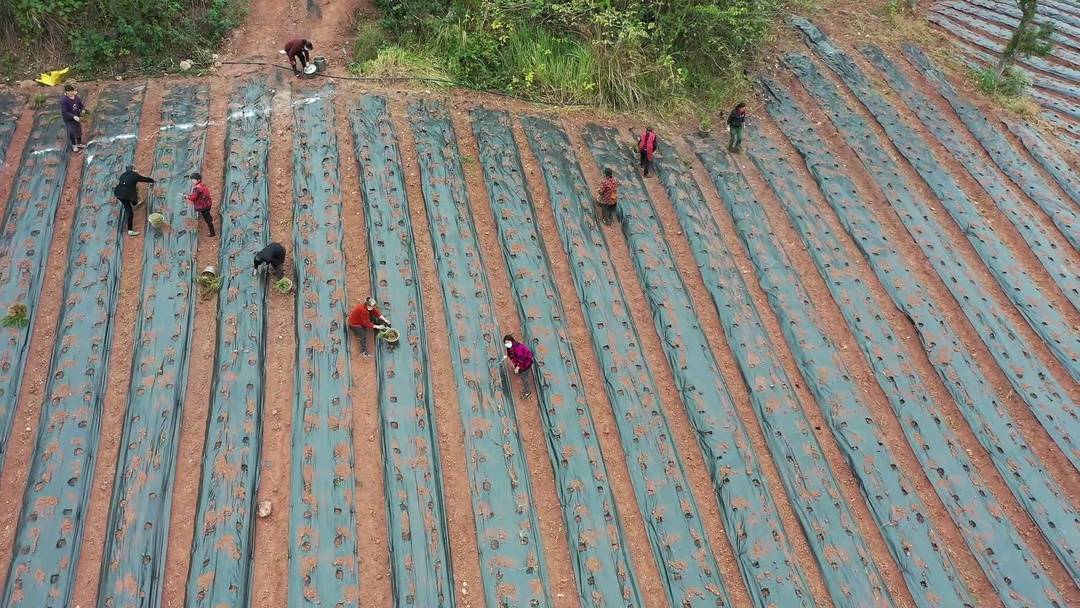 椑木镇庙儿坡村的天冬基地在山坡上,山顶新建的一口蓄水池,通过分支管道连接到土地里,方便灌溉。从无人机鸟瞰,红褐色的土地上覆盖着黑色的薄膜,垄型整齐,线条分明。