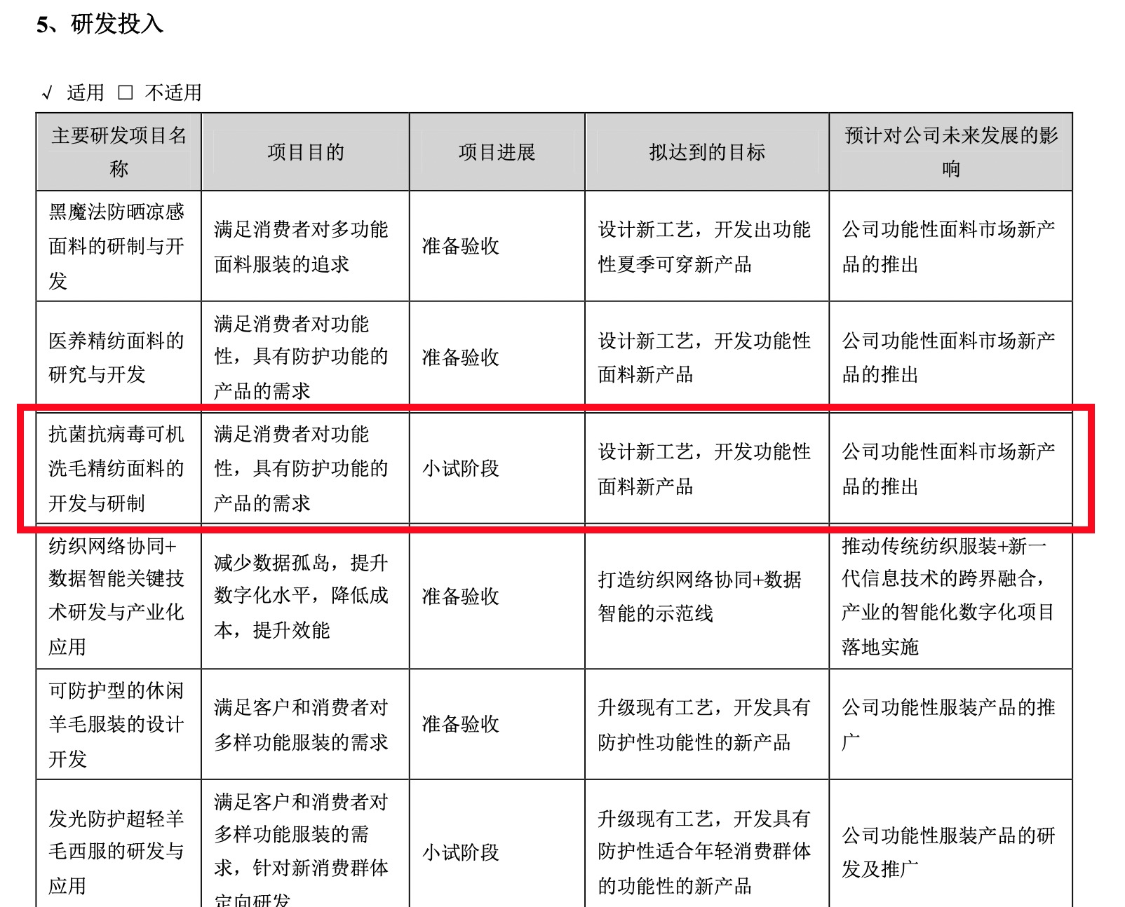 据如意集团2021年年报,其主要研发项目包括“抗菌抗病毒可机洗毛精纺面料的开发与研制”项目。该项目的项目目的,如意集团称系“满足消费者对功能性,具有防护功能的产品的需求”。