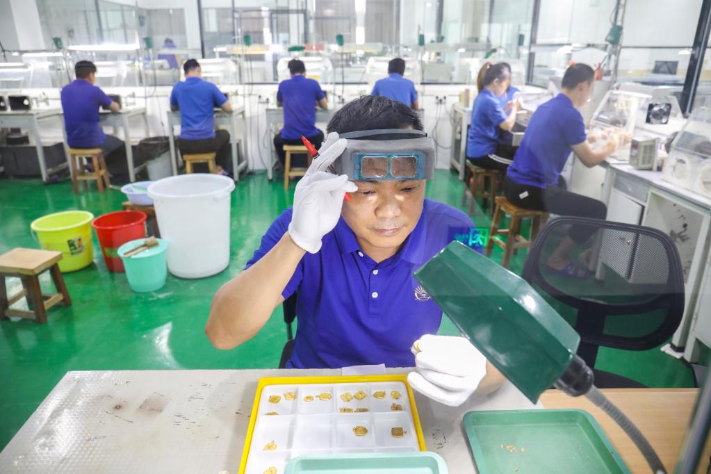 塑形、雕刻、抛光……在位于广西贺州市黄金珠宝产业园的一一一珠宝首饰有限公司,工人们正小心翼翼地对手中的黄金进行加工处理。不久后,这些精美的饰品、摆件将进入全国各大珠宝品牌商店。