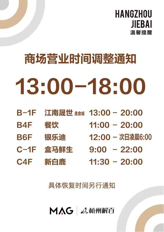 杭州解百最新通知,每天营业时间调整为下午1点至6点。