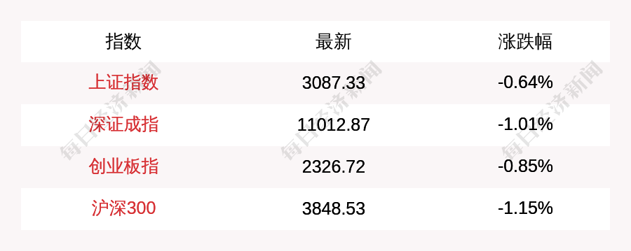北京时间12月20日11:30,上证指数早盘下跌19.79点,跌幅为0.64%,报收3087.33点,成交额1590.69亿元;深证成指下跌111.83点,跌幅为1.01%,报收11012.87点,成交额2379.17亿元;创业板指下跌19.98点,跌幅为0.85%,报收2326.72点,成交额746.62亿元;沪深300下跌44.69点,跌幅为1.15%,报收3848.53点,成交额913.13亿元。