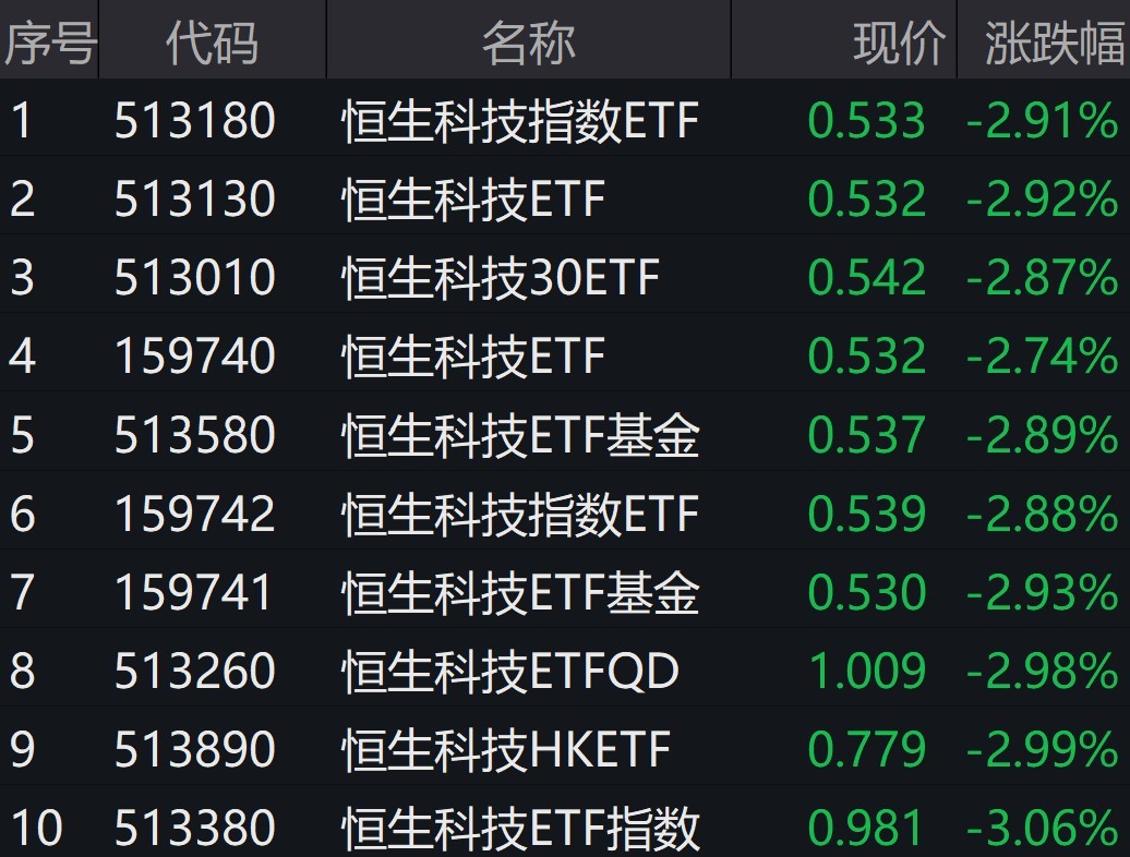 受盘面影响,场内跟踪恒生科技指数的10只ETF应声走弱,普跌约3%。
