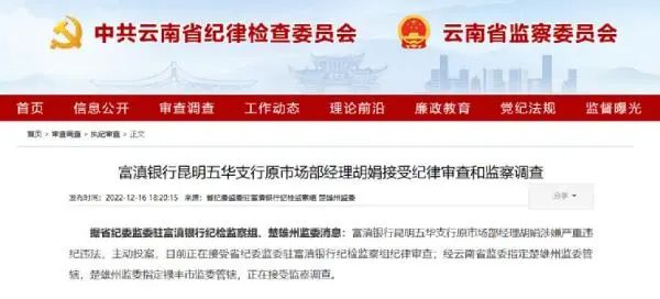 侯宁波是上周以来云南银行系统第三位主动投案的干部。12月16日,据云南省纪委监委驻富滇银行纪检监察组、楚雄州监委消息:富滇银行昆明五华支行原市场部经理胡娟涉嫌严重违纪违法,主动投案,目前正在接受省纪委监委驻富滇银行纪检监察组纪律审查;经云南省监委指定楚雄州监委管辖,楚雄州监委指定禄丰市监委管辖,正在接受监察调查。