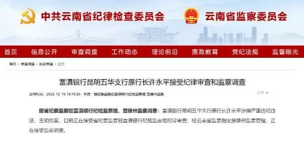 同一日,据云南省纪委监委驻富滇银行纪检监察组、楚雄州监委消息:富滇银行昆明五华支行原行长许永平涉嫌严重违纪违法,主动投案,目前正在接受省纪委监委驻富滇银行纪检监察组纪律审查;经云南省监委指定楚雄州监委管辖,正在接受监察调查。