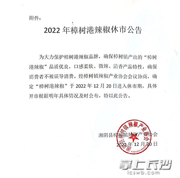 长沙晚报掌上长沙12月20日讯(全媒体记者 刘攀 通讯员 殷素)今日,湖南省湘阴县樟树镇辣椒产业协会发布公告:目前,樟树港辣椒树已进入冬季枯萎期。为保证樟树港辣椒品质,确保消费者不被假冒樟树港辣椒误导,经深入走访摸查、广泛征求意见,樟树镇辣椒产业协会宣布“樟树港辣椒”于12月20日进入休市期。