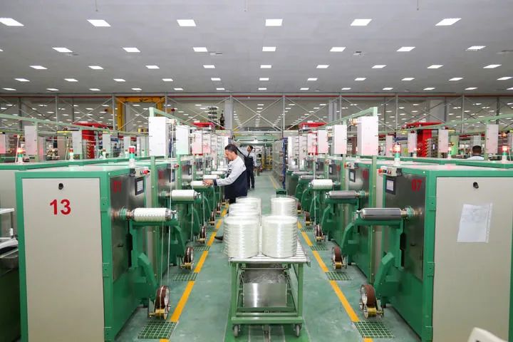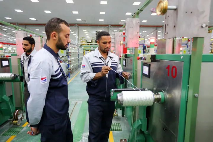 12月15日,在位于埃及苏伊士省的中国巨石埃及玻璃纤维股份有限公司(巨石埃及公司),工人在玻璃纤维生产线上工作。