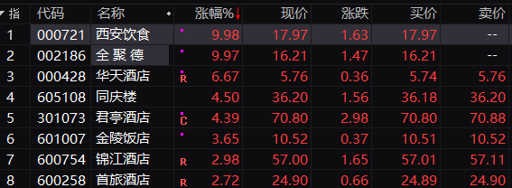 行业板块方面,酒店餐饮板块领涨,涨幅超过4%,西安饮食、全聚德双双涨停,其中全聚德已经是连续第四个交易日涨停。
