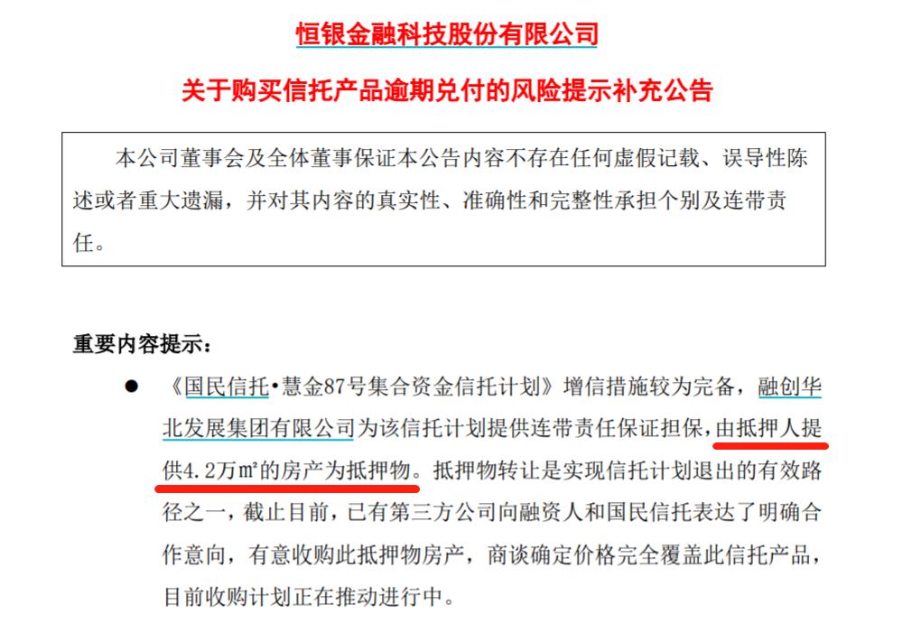 另一则补充提示公告称,该信托增信措施较为完备,融创华北发展集团有限公司为该信托计划提供连带责任保证担保,由抵押人提供4.2万㎡的房产为抵押物。