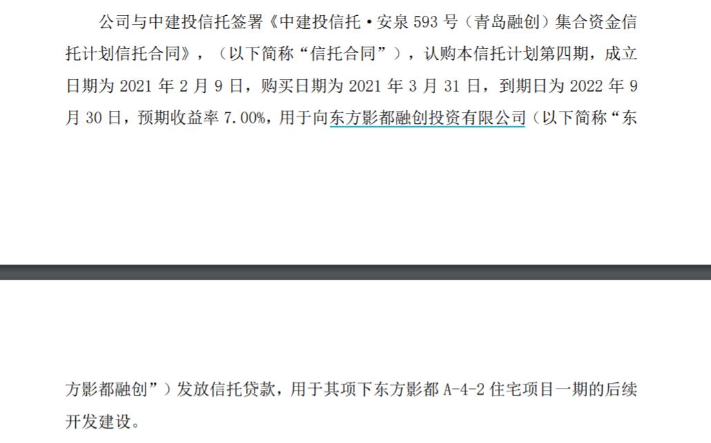 今年9月29日盘后,吉华集团发布关于购买信托产品进展情况暨延期兑付公告称,公司与中建投信托签署了“中建投信托-安泉593号”信托合同,认购该信托计划的第四期,金额为5000万元,购买日期为2021年3月31日,到期日为2022年9月30日,预期收益率7.00%,用于向东方影都融创投资有限公司发放信托贷款,用于其项下东方影都A-4-2住宅项目一期的后续开发建设。
