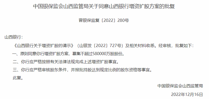 12月20日,山西银保监局发布批复,同意山西银行增资扩股方案,募集不超过58亿股股份。山西银行应严格审核股东条件,并报批持股达到规定比例的股东资格等事宜。